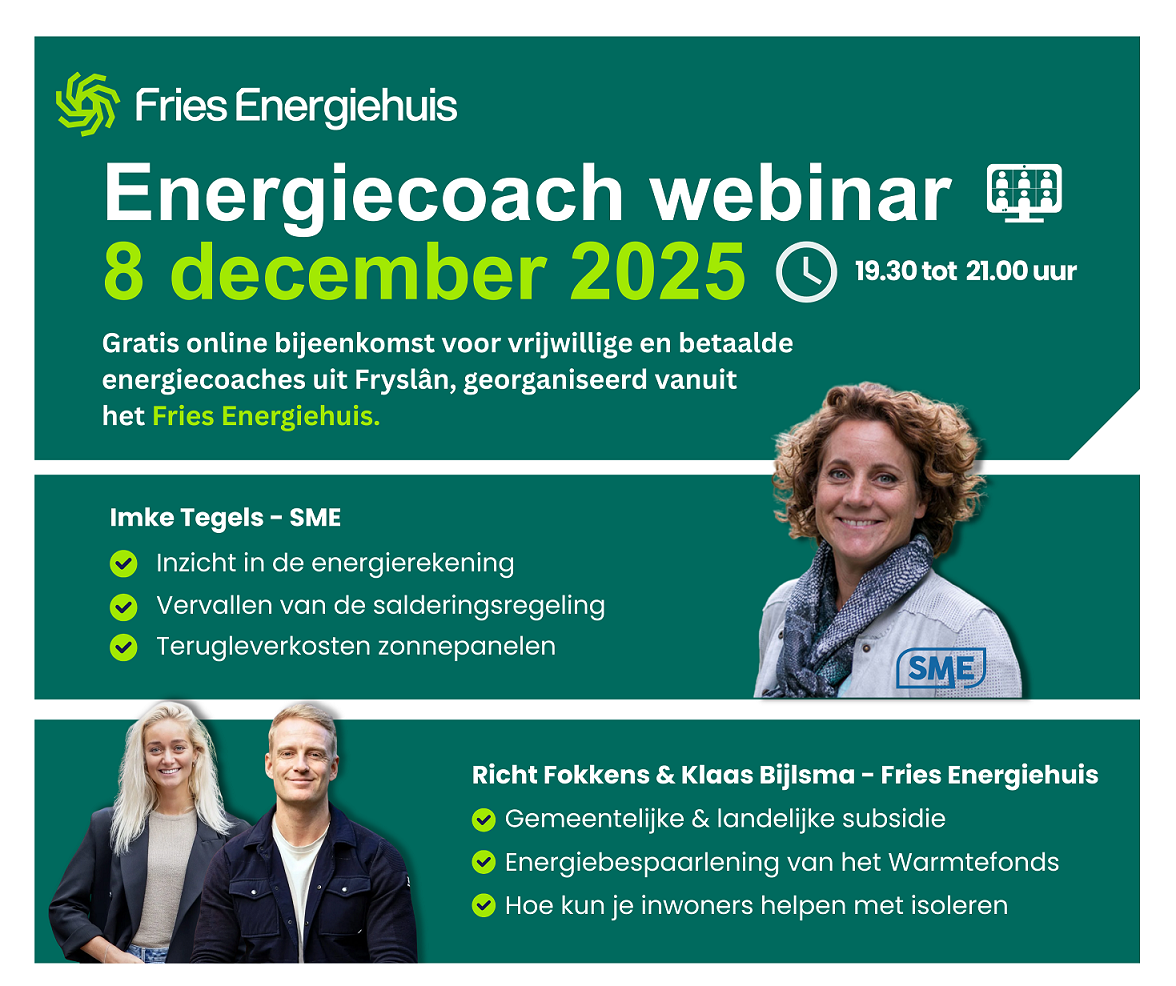 Het Fries Energiehuis nodigt jullie graag uit voor een online energiecoach webinar op maandag 8 december. Tijdens deze bijeenkomst geeft Imke Tegels van SME inzicht in de ontwikkelingen rondom de energierekening, saldering en de terugleverkosten van zonnepanelen. Zij laat zien hoe je deze onderwerpen op een duidelijke en begrijpelijke manier kunt uitleggen aan bewoners.
